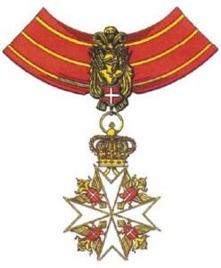 The badge of the insignia of the Order has an eight pointed white enameled cross. Between each arm of the cross is a gold two headed eagle and the Arms of the Order, which is a white cross on a red oval shield. The cross is surmounted with a gold crown and attached by a link ring to a gold trophy bearing the Arms of the Order. The insignia is suspended from a neck ribbon.