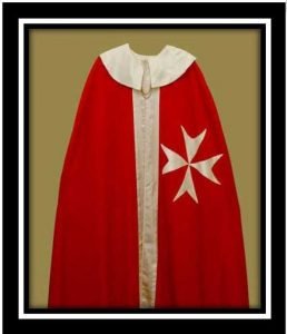 The mantle of the Order is a full-length red robe, vertically edged with white satin and with a white satin collar. The mantle is fully lined with white satin. An eight-pointed Maltese cross also in white satin is on the left side of the mantle. Knight/Dame Commander of Justice Mantle collar with two gold braid.