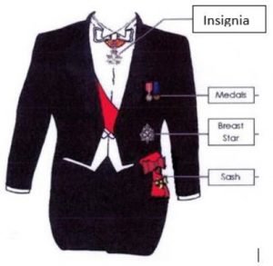 Knight/Grand Dame Grand Cross of Justice and Bailiff/Grand Dame Grand Cross of Justice wear the Sash of the Order (with the badge of the Order on the lower edge) over the right shoulder to the left hip and under the jacket. The Sash is worn on a formal occasion.